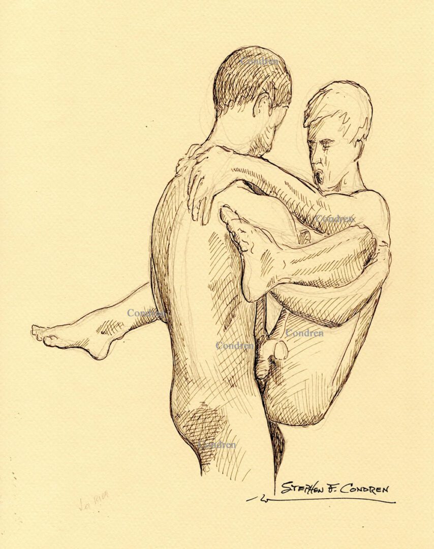 This nude male figure drawing is a pleasure to talk about here because it contains aesthetic values. The figure drawing shows two naked gay brothers fucking each other in missionary style as one holds up the other while standing.
